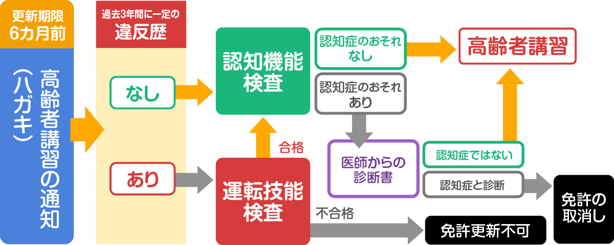 「認知機能検査」と「高齢者講習」を受講しなければ更新手続きができません。また、過去3年間に一定の違反歴がある方は、「運転技能検査」も受けなければいけません。